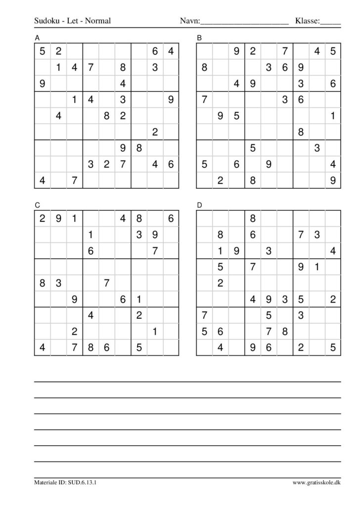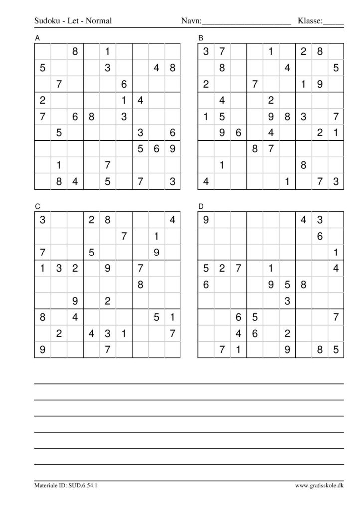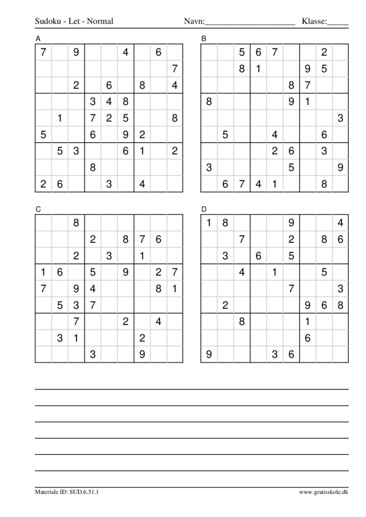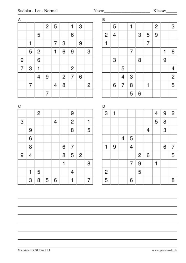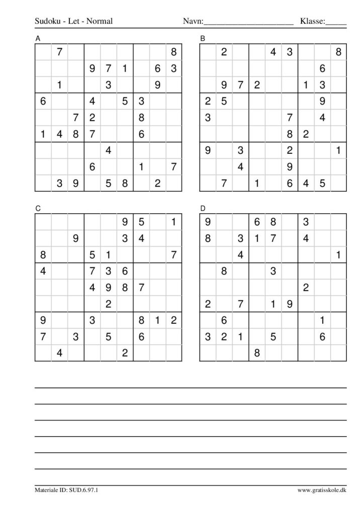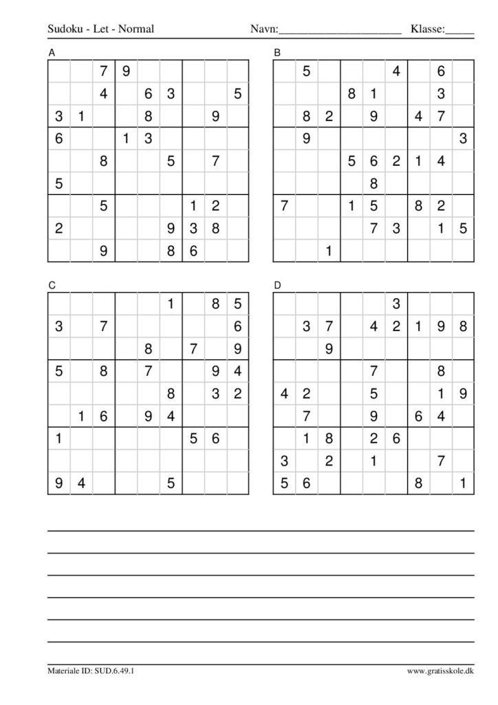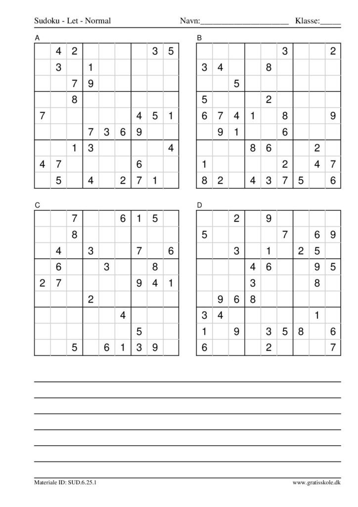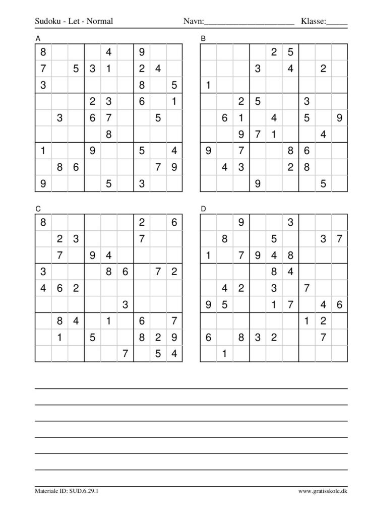Her finder du en liste med gratis sudoku til print i niveauet “let”. Der er fire sudokuer på hvert ark. Klik på hvert billede for at blive ført videre til PDF-filen, hvor hver sudoku gratis kan downloades.