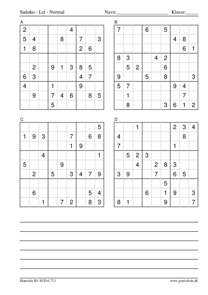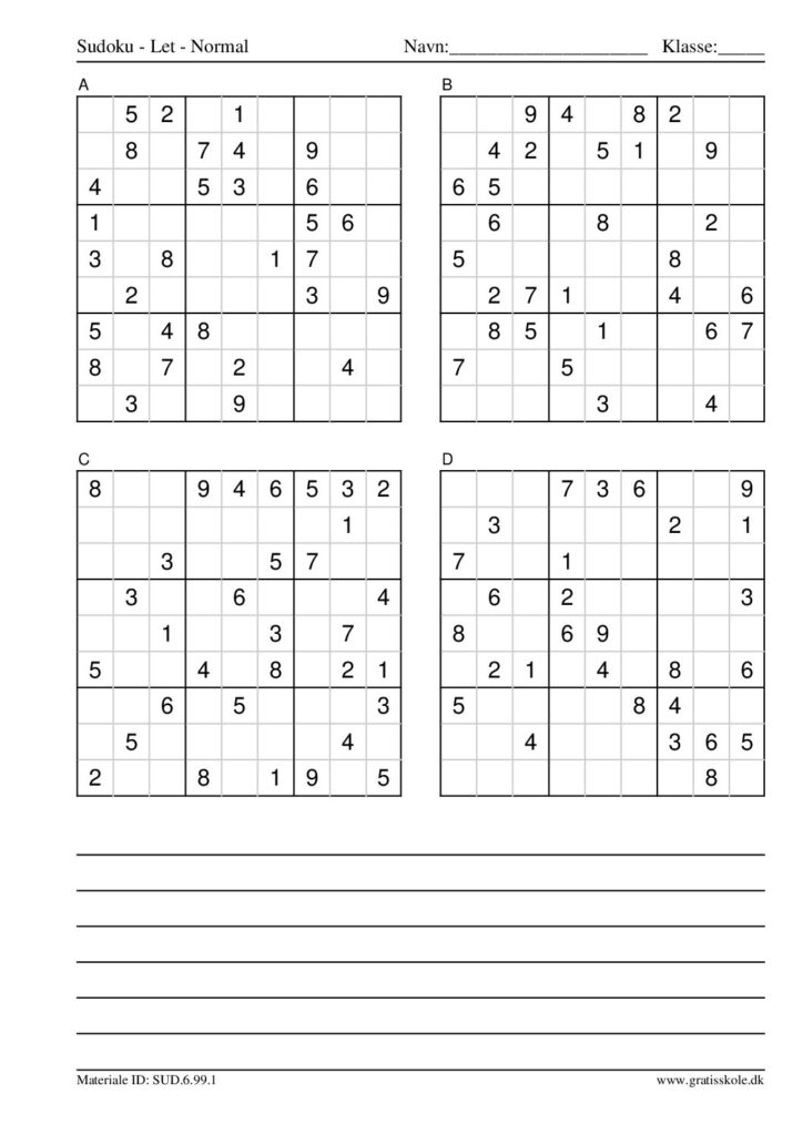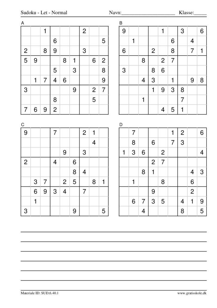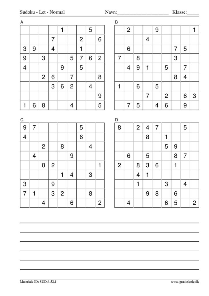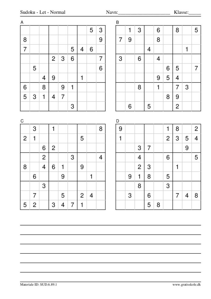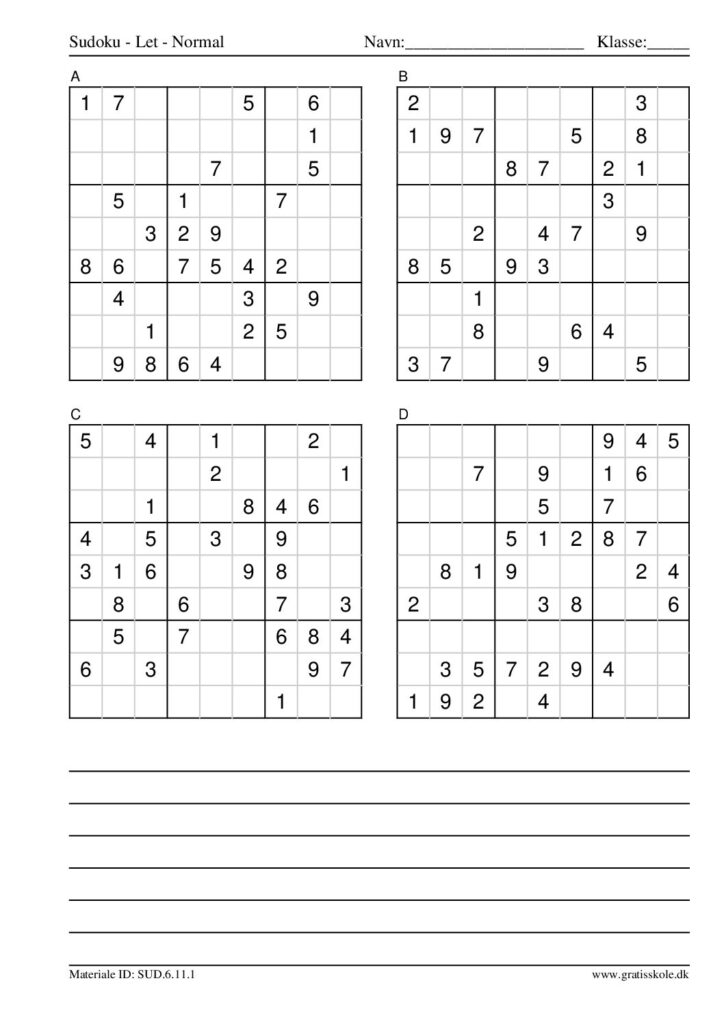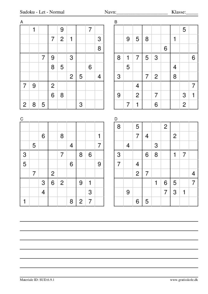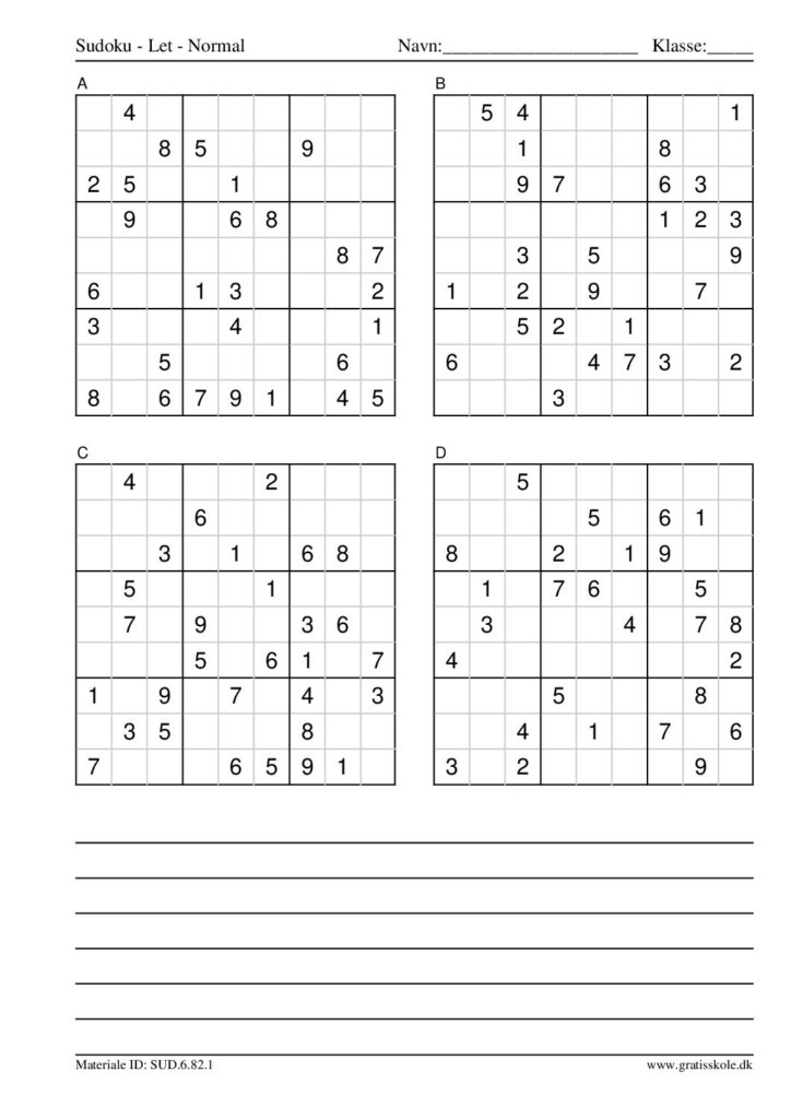 Her finder du en liste med gratis sudoku til print i niveauet “let”. Der er fire sudokuer på hvert ark. Klik på hvert billede for at blive ført videre til PDF-filen, hvor hver sudoku gratis kan downloades.
